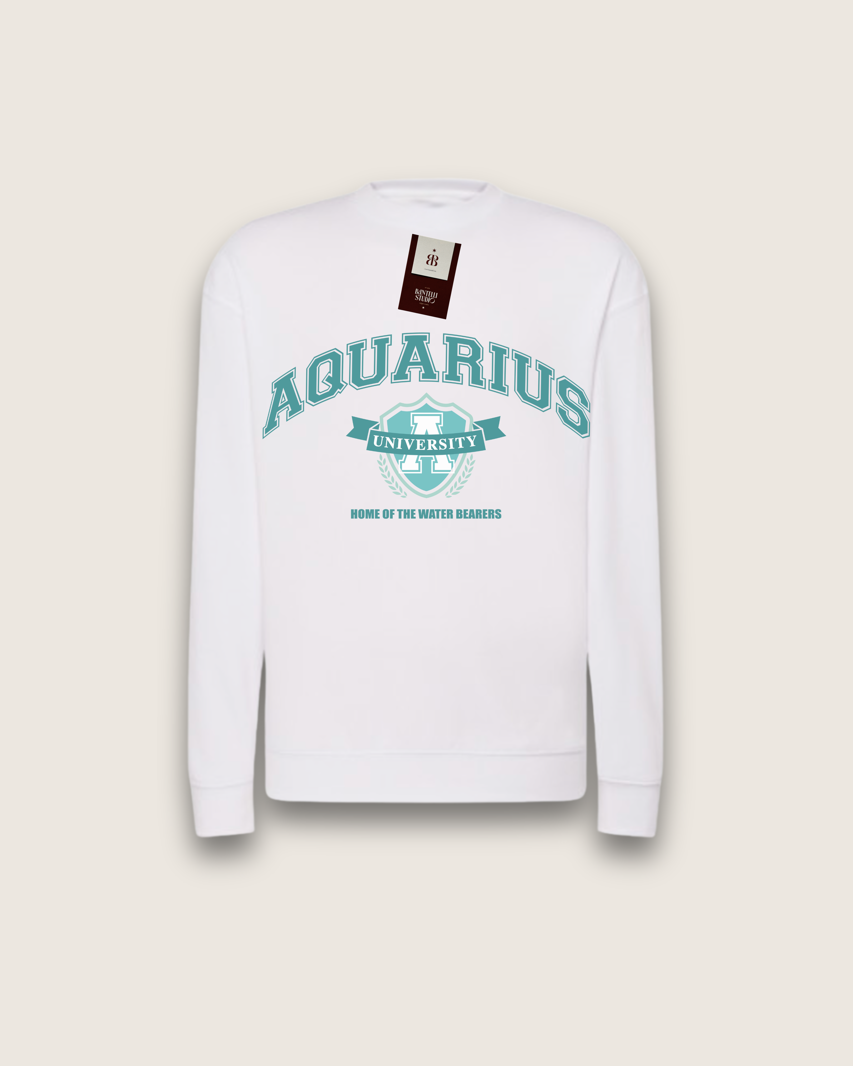 Este pullover 100% algodón peinado en blanco combina comodidad y estilo con un estampado retro y universitario del signo zodiacal Acuario.