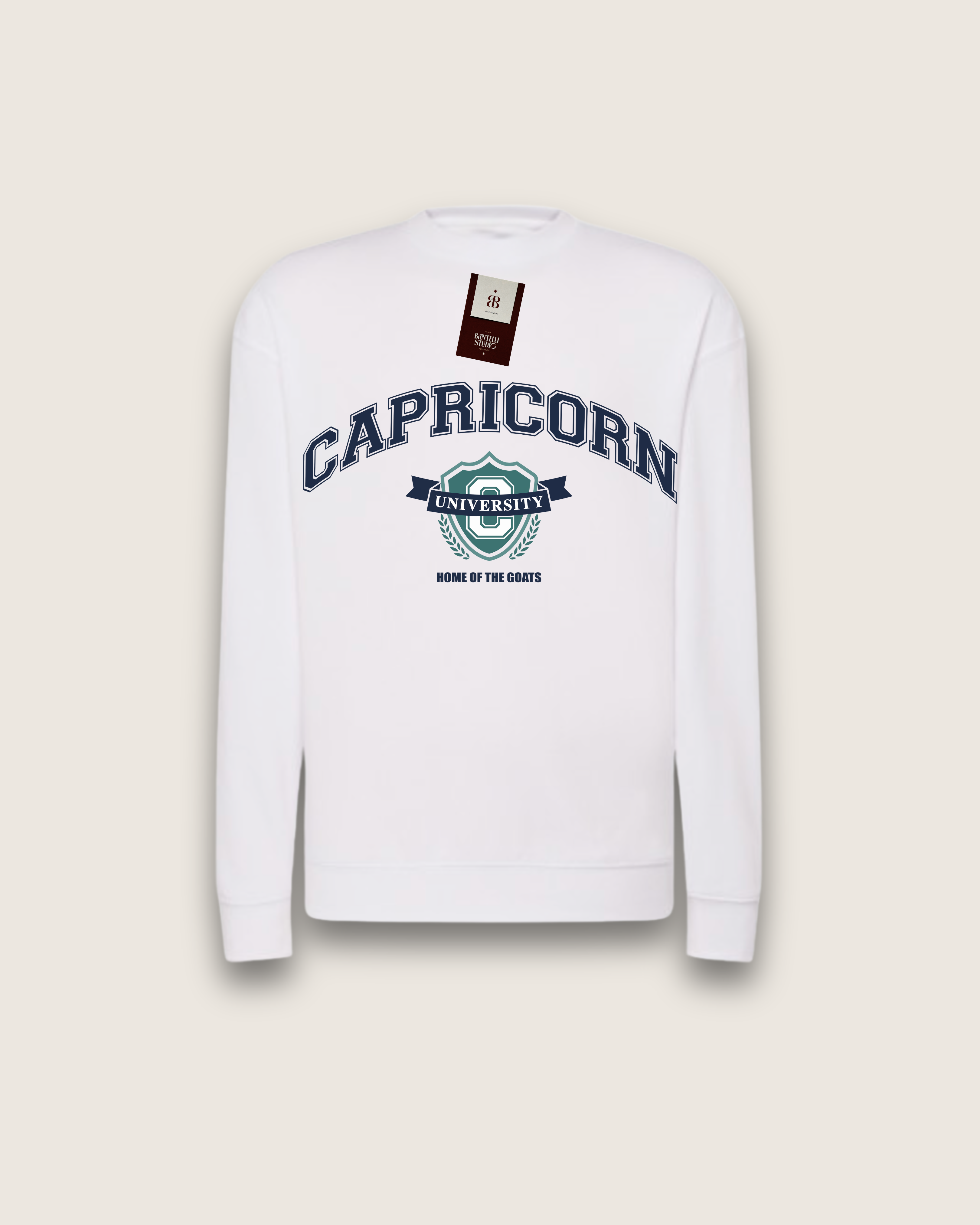Este pullover 100% algodón en blanco combina comodidad y estilo con un toque retro. Su estampado universitario del signo Capricornio le da un aire divertido y original, perfecto para quienes quieren mostrar su personalidad con orgullo y buen humor.