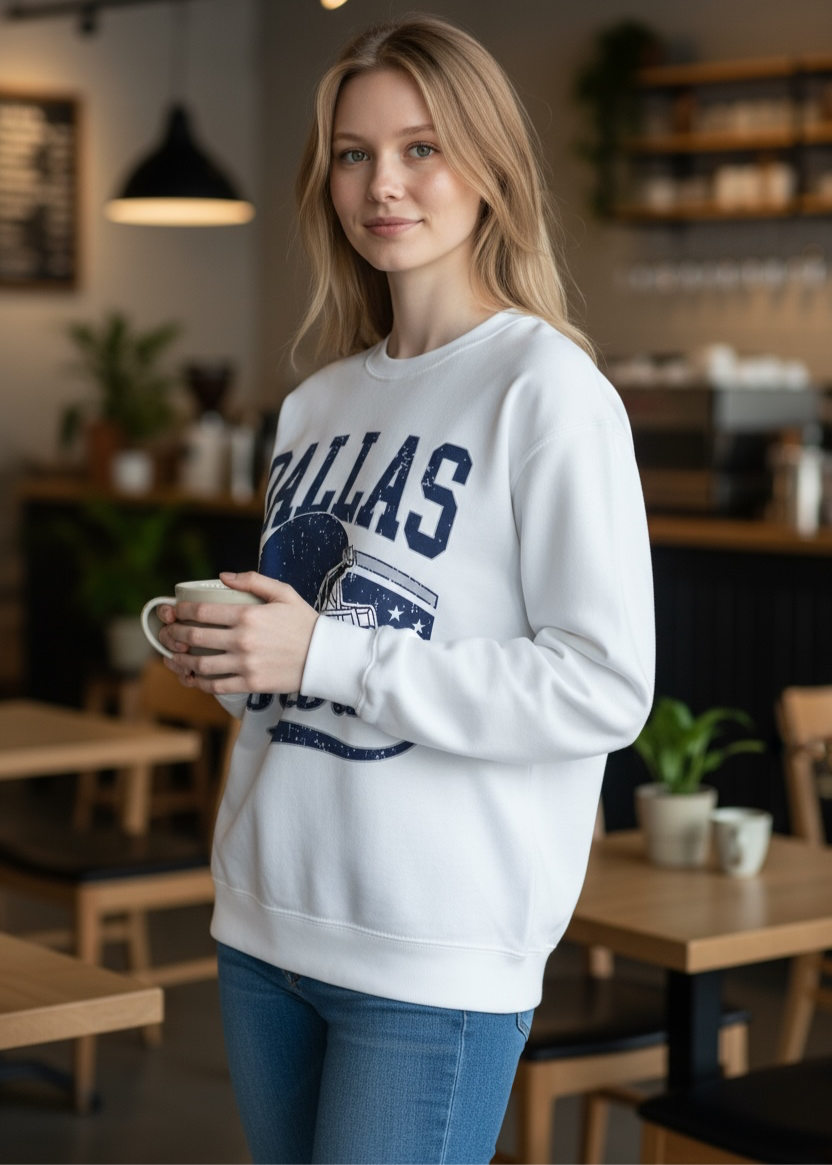 Este pullover blanco de algodón peinado es perfecto para los fans del equipo de Dallas que quieren lucir cómodos y con estilo.