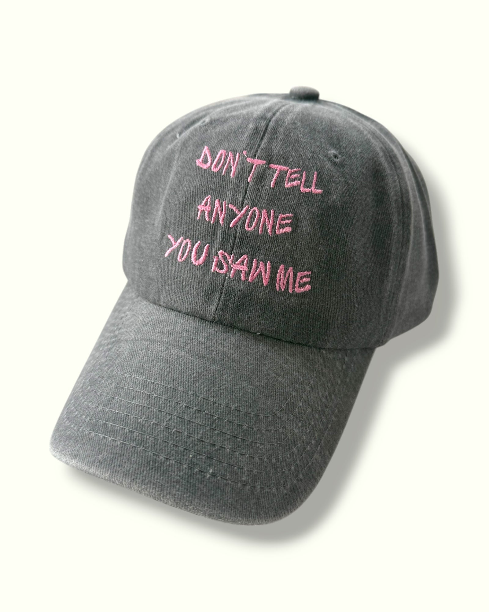 Esta gorra gris deslavada lleva bordada en hilo rosa la frase ‘Don’t tell anyone you saw me’, perfecta para quienes aman el misterio con un toque de humor.