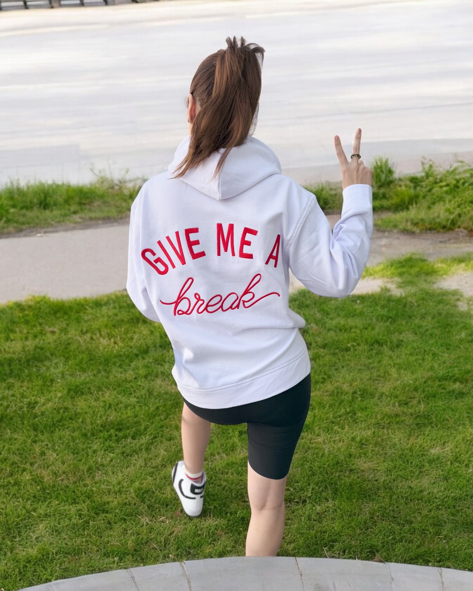 Celebra el Día del Amor y la Amistad con estilo y actitud. Esta sudadera blanca de algodón peinado combina suavidad, comodidad y un toque de romanticismo moderno. Su detalle estrella: un elegante bordado en hilo rojo en la parte trasera que dice "Give me a break", perfecto para quienes llevan el corazón y el estilo a flor de piel.