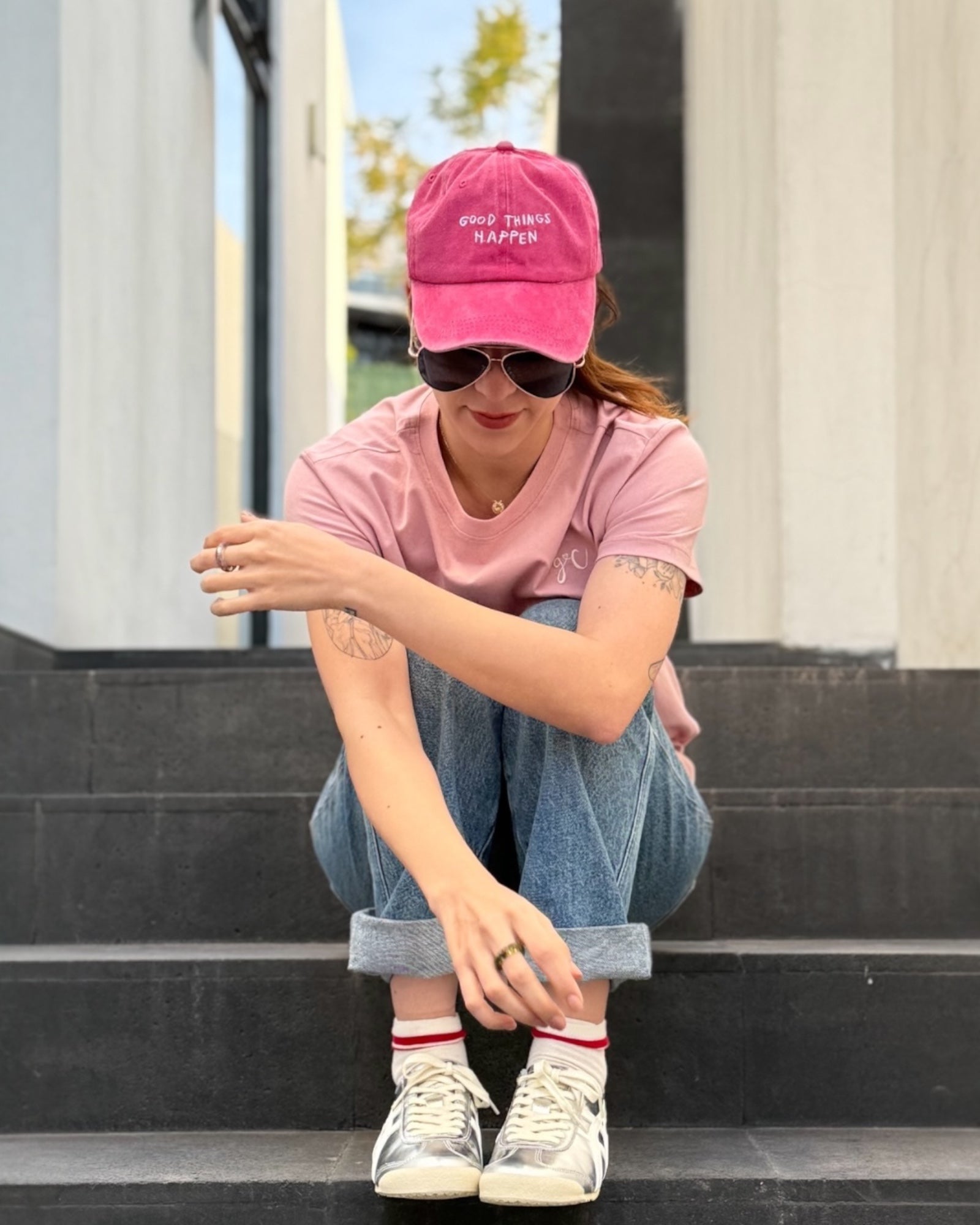 ¡Dale un toque de estilo y actitud a tu outfit con esta gorra fiusha que grita positividad!