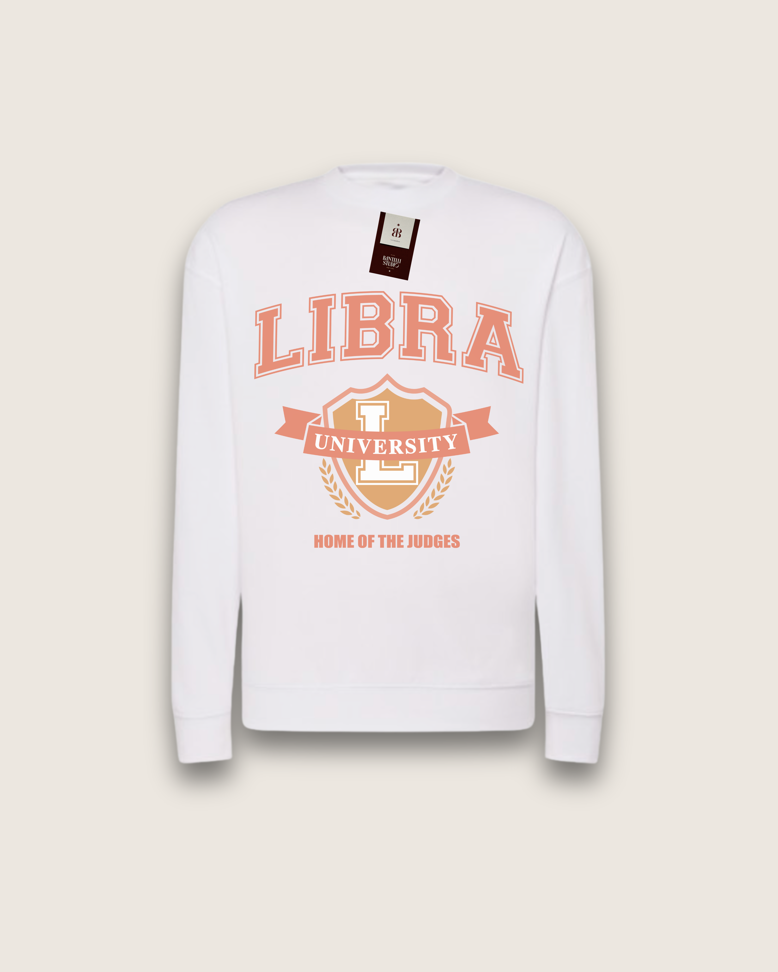 Disfruta la comodidad del algodón peinado 100% con este pullover blanco que destaca por su estampado del signo Libra con un toque retro y universitario.