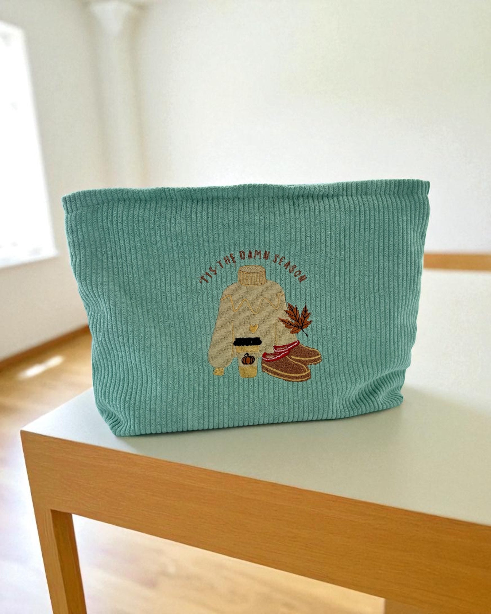 Este organizador de pana con bordado de otoño es el compañero perfecto para mantener tus básicos siempre a la mano y bien ordenados.