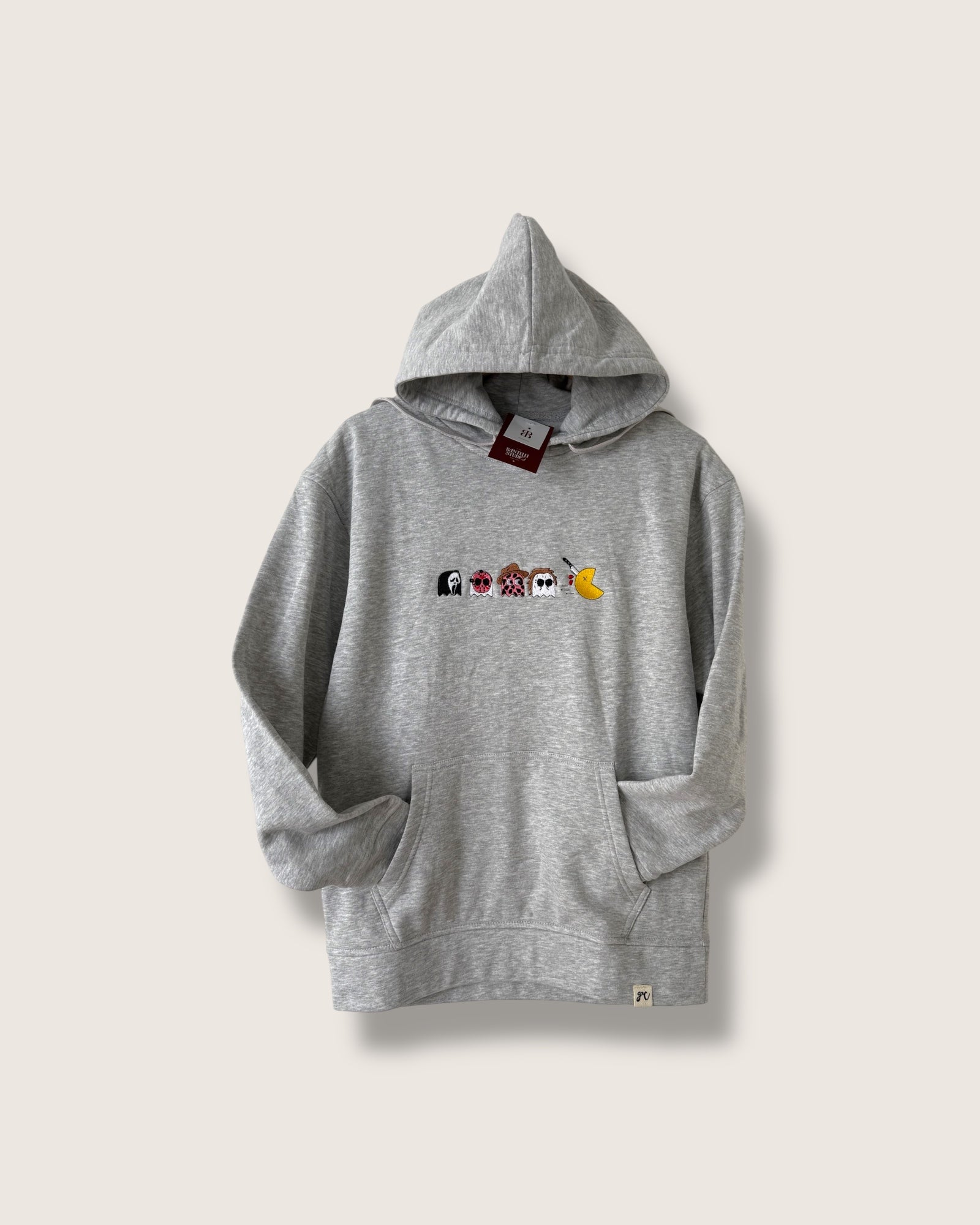 Disfruta la comodidad del algodón peinado con este hoodie gris jaspe, decorado con un divertido bordado estilo Pac Man que presenta a tus personajes de terror favoritos.