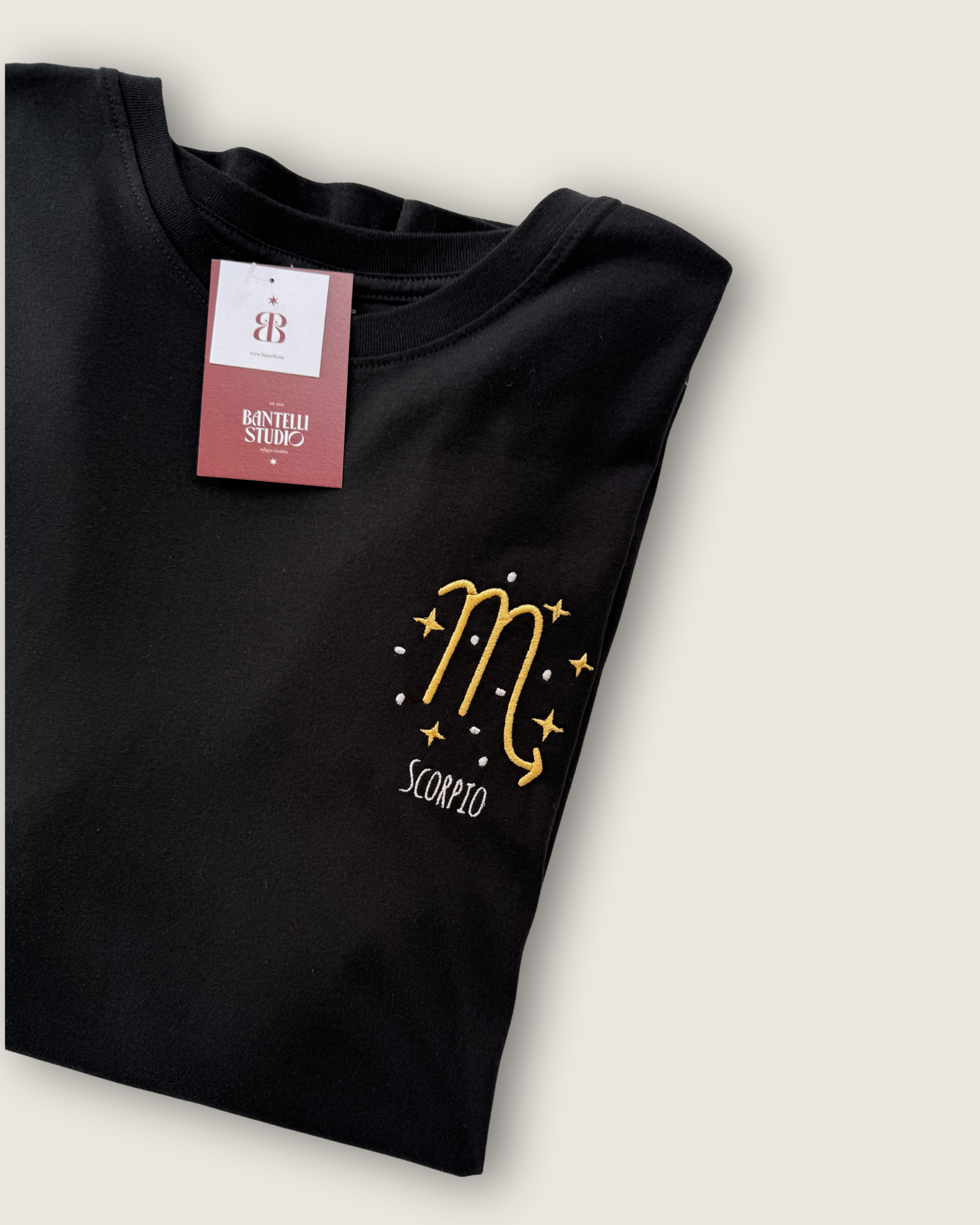 El delicado bordado en hilo dorado destaca el signo zodiacal Scorpio, añadiendo un toque único y brillante que refleja la personalidad apasionada y misteriosa de Escorpio.