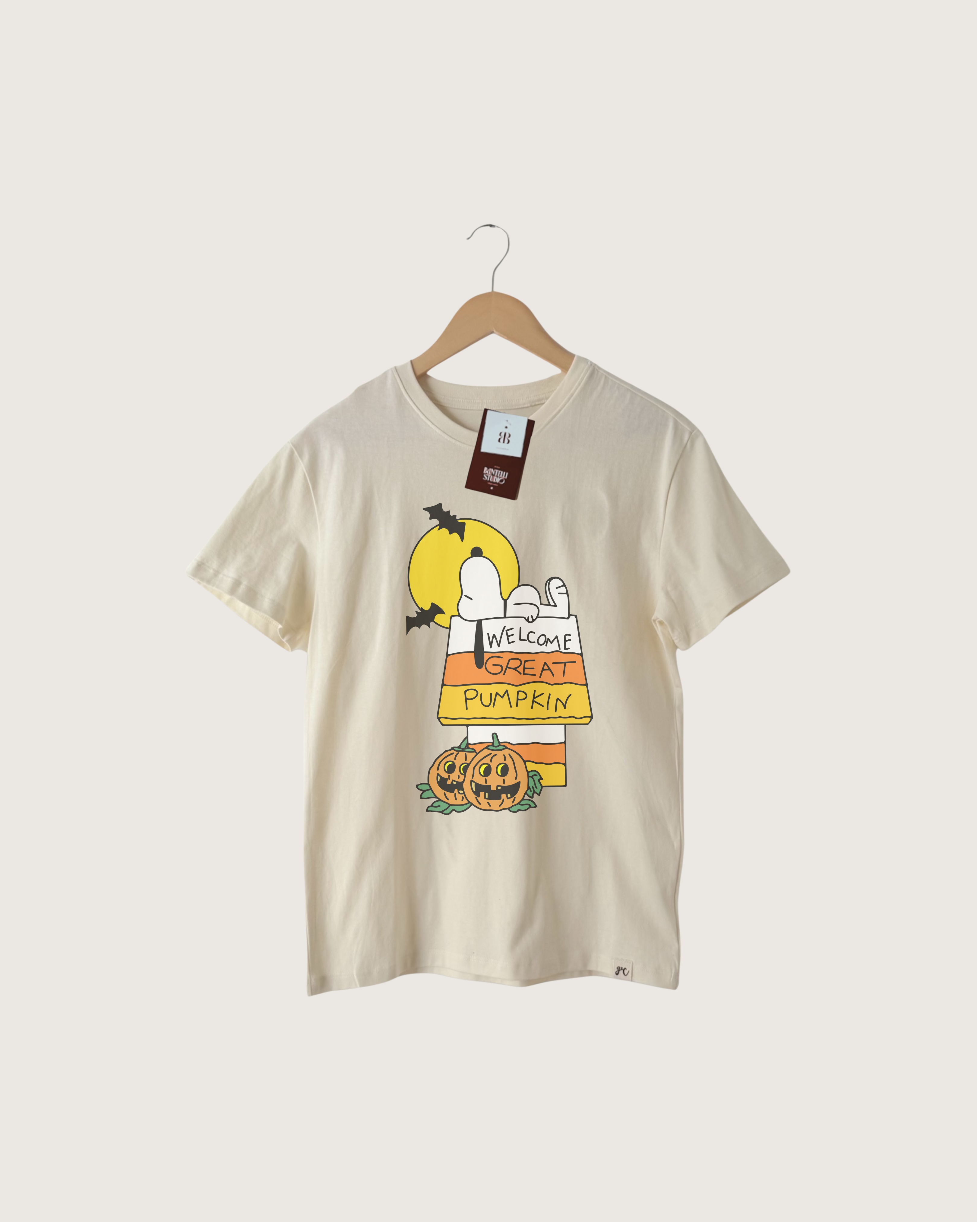 Esta camiseta 100% algodón peinado en color marfil presenta un divertido estampado con un personaje animado en su casita, acompañado por la frase "Welcome Greating Pumpkin".